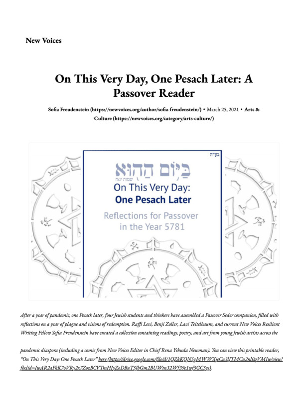 Four Jewish students and thinkers have created a Passover Seder companion reflecting on the pandemic and envisioning the future. The collection includes poetry and art from young Jewish artists.