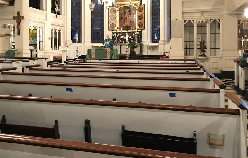 Notice the pews with blue masking tape indicating appropriate social distancing for worshippers. Mass is offered on Saturday at 5 pm plus three masses Sunday, including one in Spanish. No baptisms at font have been allowed since Pandemic.